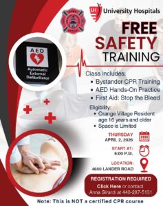Orange Village Fire Department and University Hospitals are offering a Free Safety Training – Thursday, April 2, 2026 at 6:00 PM