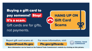 The money you put on gift cards is like cash — once it’s spent, you almost certainly can’t get it back. Fraudsters have developed two distinct ways to exploit that fact: gift card payment scams and outright gift card theft. If you something does not feel right to you, call a family member for advice or contact the Orange Village Police Department at 440-247-7321.